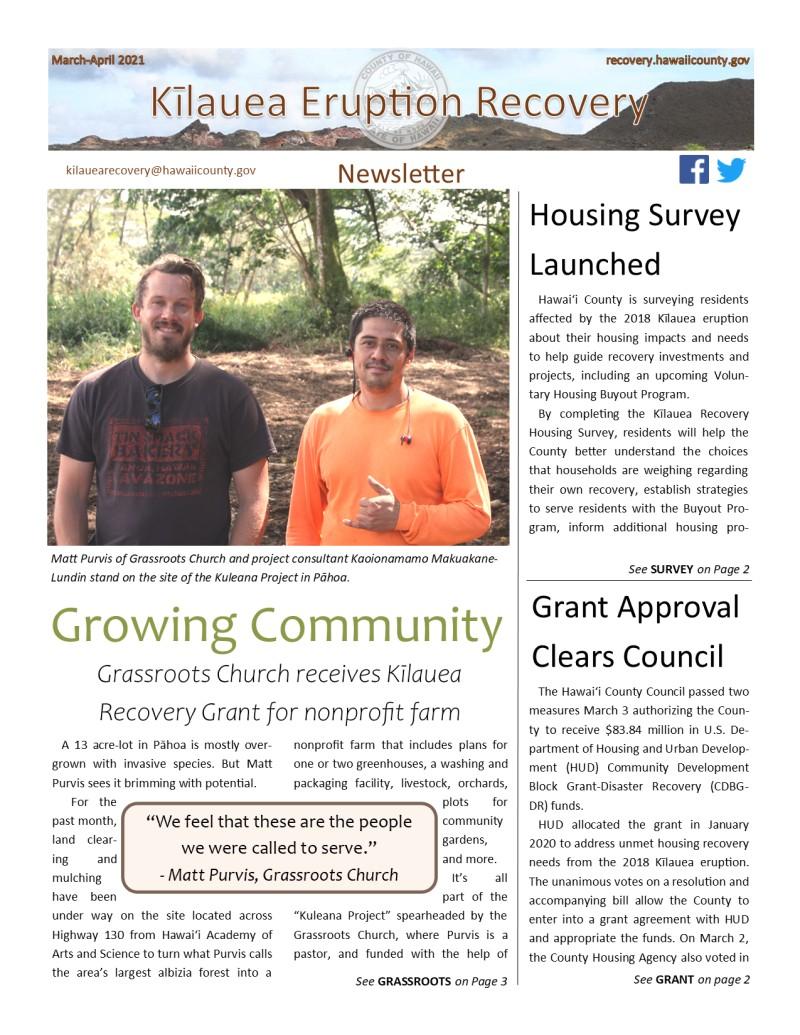 The March-April 2021 Kīlauea Recovery Newsletter is now available. In this issue: - Growing Community: Grassroots Church receives Kīlauea Recovery Grant for nonprofit farm - Housing Survey Launched - Grant Approval Clears Council - Highway 137 Restoration Planned - Pohoiki Boat Ramp Options Presented - Fissure 8 named