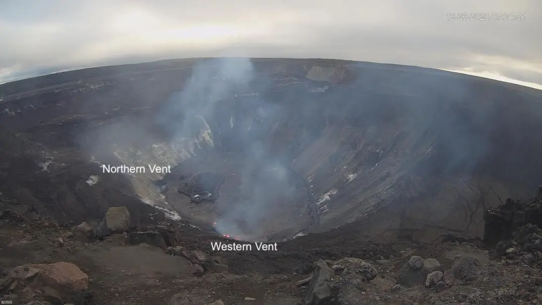 The eruption continues this morning in Halema‘uma‘u crater at Kīlauea's summit. The big change overnight happened around 2:40 a.m. when USGS crews noted that activity at the northern vent is down significantly and fountaining started back up at the western vent. Fountaining as high as 32 feet has been observed by USGS. It appears the northern vent got blocked by the lava lake and the pressure caused the western vent to start up again. The lava lake is now 583 feet deep, up 5 feet over the past 24 hrs. According to USGS this morning, the western vent is 111 feet above the lava lake at the moment. That means there is plenty of time for the western vent to fountain before it will get blocked by the lava lake. More information and updates to come. Latest from USGS Saturday Morning: Activity Summary: Lava activity is confined to Halemaʻumaʻu from two vents on the north and northwest sides of the crater. As of 2 pm yesterday, the crater lake was still 176 m (577 ft) deep and the lake level appeared to be 2 m (6 ft) lower leaving a narrow black ledge around the north edge. Early this morning, the west vent reactivated while the north vent quieted and started to drain the lake. Reduced SO2 emissions were measured last night. Summit Observations: Preliminary analysis of sulfur dioxide emission rates measured last night suggest that the rates have dropped to 16,000-20,000 tonnes/day. Summit tiltmeters continued to record slowing deflationary tilt until just before 3 am this morning (Dec. 26) when it switched to inflationary tilt. Seismicity remained elevated but stable, with a few minor earthquakes and tremor fluctuations related to the vigor of fissure fountaining. Halemaʻumaʻu lava lake observations: The north vent continued erupting lava into a lake within Halemaʻumaʻu crater. The west vent was incandescent until about 2:40 am this morning (nearly coincident with the switch from deflationary to inflationary summit tilt) when it became vigorously active with up to 3 narrow lava streams into the lake . After 3 am the north vent quieted and started to slowly drain lava from the lake. The lava lake within Halemaʻumaʻu crater remained about 176 m (577 ft) deep and about 415 m (1,360 ft) below the Halemaʻumaʻu rim as of yesterday afternoon (Dec. 25th). The lava lake volume remained about 21 million cubic meters (27 million cubic yards or 4.8 billion gallons). USGS field crews are currently making measurements to confirm whether the lake surface continues to drop. An island of cooler, solidified lava floating in the lava lake, which has been drifting slowly northeastward in the lake, has apparently grounded itself near the north vent. It is still about 260 m (850 ft) in length and 115 m (375 ft) in width based on the Dec. 23rd thermal map (https://www.usgs.gov/maps/december-23-2020-k-lauea-summit-eruption-thermal-map). At about 6 am this morning (Dec. 26), the island started to slowly drift to the southeast. Webcam views of the lava lake can be found here: https://volcanoes.usgs.gov/volcanoes/kilauea/multimedia_webcams.html Image 1 As of about 2:40 a.m. HST on December 26, 2020, activity at the west vent in Halema‘uma‘u crater wall at Kīlauea's summit has increased. This photo, taken at approximately 5:15 a.m. HST shows fountaining at the west vent, and lava pouring from the north end of the fissure into the growing lava lake. HVO field crews monitoring the activity overnight measured the west vent lava fountains as at least 10 m (32 ft) high. USGS photo H. Dietterich. Image 2 The eruption continues in Halema‘uma‘u crater at Kīlauea's summit. HVO field crews observing the activity overnight noted that at approximately 2:40 a.m. HST December 26, 2020, activity at the west vent in the wall of Halema‘uma‘u rejuvenated: the west vent has become more active than the northern vent. Since the start of the eruption on December 20 at 9:30 p.m. HST, the northern vent has been dominant and erupting more vigorously than the weaker western vent. Over the past two days, the northern vent has slowly been drowned by the rising lava lake, and this photo (taken at about 5:15 a.m. HST on Dec. 26) shows that the west vent is now erupting more vigorously. At 3:30 a.m. HST today (Dec. 26), HVO field crews measured the rising lava lake as 178 m (583 ft) deep. USGS photo by H. Dietterich. Image 3 (map) Lava lake level measurements collected during a field visit of Kīlauea Volcano's summit around 2:15 p.m. HST on December 25, 2020, were used to create a preliminary lava lake depth map. When compared to pre-eruption topographic models, it shows that the bottom of Halema'uma'u crater has been filled by almost 176 m (578 ft) of lava. Map by H. Dietterich. Image 4 Webcam image from this morning of Halemaʻumaʻu, lava lake, and down-dropped block [KWcam] From the west rim of the new summit collapse features