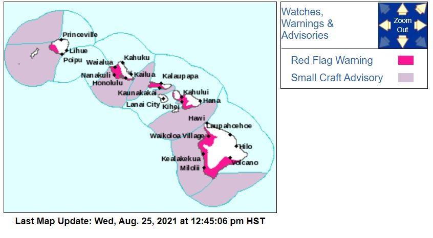 A Red Flag Warning for leeward areas has been issued due to gusty winds and low humidity by the NWS Honolulu. Text from NWS: Although windward areas did recently receive some rainfall, fuels remain dry in leeward areas. Combined with gusty trade winds and low relative humidities, critical fire weather conditions are expected over leeward areas this afternoon, and again on Thursday afternoon. The National Weather Service in Honolulu has issued a Red Flag Warning, which is in effect until 6 PM HST Thursday (8.26.2021). * AFFECTED AREA...Leeward portions of all Hawaiian Islands. * WIND...Trade winds up to 20 mph, with locally higher gusts. * HUMIDITY...40 to 45 percent through the afternoon hours. * IMPACTS...Any fires that develop will likely spread rapidly. Outdoor burning is not recommended. A Red Flag Warning means that critical fire weather conditions are either occurring now or will shortly. A combination of strong winds, low relative humidity, and warm temperatures can contribute to extreme fire behavior. A Red Flag Warning does not predict new fire starts.