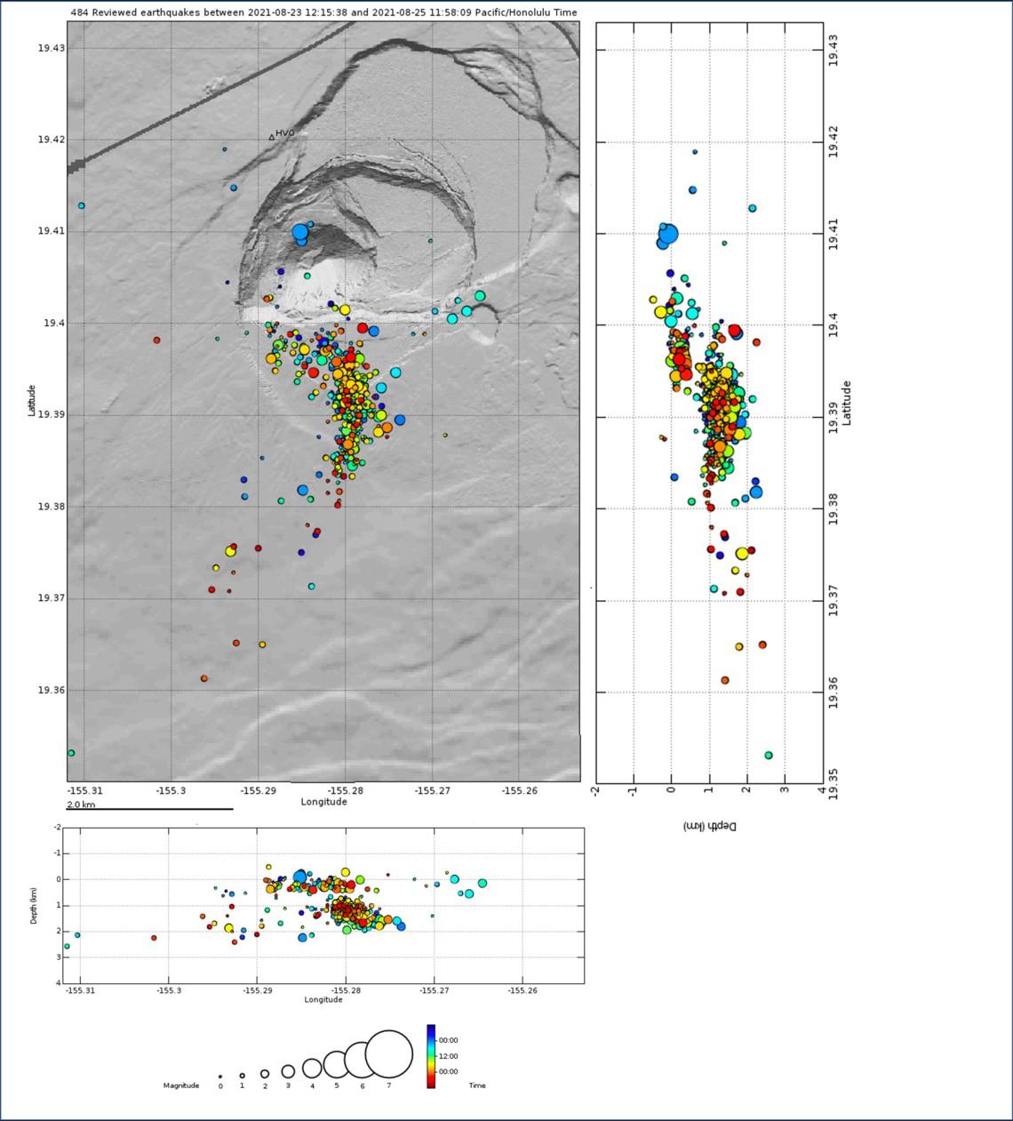 USGS-HVO: "Late Monday afternoon, earthquake activity picked up at Kīlauea’s summit. At about 1:30 a.m. HST on Tuesday, that activity intensified, and it became clear that seismicity and increasing deformation were indicating a new intrusion of magma. The seismicity extended southward from Hālemaʻumaʻu crater, to an area south of Kīlauea caldera. An “intrusion” occurs when magma is injected into rocks underground, and new intrusions can be the first indication of a potential eruption. Because seismicity indicated the intrusion was within 1–2 km (0.6–1.2 miles) of the surface, the USGS Hawaiian Volcano Observatory (HVO) increased Kīlauea’s Volcano Alert Level and Aviation Color Code from Advisory/Yellow to Watch/Orange at 5:34 a.m. on Tuesday. Heightened rates of seismicity occurred throughout the day on Tuesday, and summit tiltmeters showed ground motions consistent with continued growth of the intrusion. Seismicity and deformation activity peaked on Tuesday evening; then, both decreased considerably, and the intrusion appeared to have halted. In seeking to understand current events, volcanologists often look to the past. We look for “analog” events that are similar to what is happening and that will give us a sense for what the future might hold. A very close analog event for this week’s activity was an intrusion in 2015. The 2015 sequence of events started with inflation of the shallow Halemaʻumaʻu magma reservoir, which triggered the overflow of Kīlauea’s summit lava lake onto the floor of the crater. Seismicity then migrated south to the same area that has been active during the past few days. The episode last for about 4 days and also ended with an intrusion in an area south of the modern caldera outline. These two south caldera intrusions (2015 and 2021) have strikingly similar patterns of seismicity and deformation, even though the 2015 event started quite differently. The patterns of seismicity and deformation suggest that the location and orientation of the intrusions are also quite similar. Regional uplift patterns observed by satellite confirm that the center of the intrusive activity in both cases is well to the south of the caldera boundary faults. A third similar event was also recorded in 2006, prior to the formation of the lava lake within Halemaʻumaʻu. This area is well known for being the beginning of the path that magma follows to the lower regions of the Southwest Rift Zone of Kīlauea. Earthquakes have been used to track the progress of magma intrusions through this pathway and HVO scientists call this “the seismic Southwest Rift Zone.” Magmatic intrusions followed this pathway in the 1960s, 1970s, and early 1980s, but only one of these events led to an eruption. In December 1974, an intrusion began following this path southward, but erupted as a series of short fissure segments with a total length of 5 km (3 miles) as it turned southwest. The caldera collapse events in 2018 radically changed the surface landscape of Kīlauea’s summit. However, it was unclear how much of the sub-surface magma storage and plumbing might have been changed. The fact that magma is being intruded and stored close to the caldera shows that some of the magmatic connections remain unchanged by the 2018 collapse. The similarities of the 2015 and 2021 intrusions suggest that at least some of the summit connections are still in place. This is yet another line of evidence that while our view of Kīlauea’s surface is entirely new, the volcano is not as much changed underground. The magma storage system beneath Kīlauea’s summit has clearly been refilling and inflating as it recovers from the 2018 eruption. Events like the recent summit eruption and this intrusion are the expected signs that the system is repressurizing due to continued input of magma. We expect to see continued intrusive activity and possible eruptive activity near the summit as magma reconnects with old pathways and storage regions. On Thursday morning, the Volcano Alert Level and Aviation Color Code for Kīlauea was changed again from Watch/Orange, back down to Advisory/Yellow as seismic activity and deformation had returned to pre-intrusive levels within the region. However, at the time of this writing on the evening of August 26, seismic activity and ground deformation had resumed in Kīlauea’s south caldera region. Perhaps, this is only the first chapter in a much longer story! Volcano Watch is a weekly article and activity update written by U.S. Geological Survey Hawaiian Volcano Observatory scientists and affiliates. " IMAGES AND CAPTIONS FROM USGS-HVO [1] - Top panel shows tiltmeter data from the Sandhill (SDH) instrument, located within Kīlauea’s south caldera region. The line indicates that the instrument tilted towards an azimuth of 300° (northwest) as the ground in the area inflated. Occasional spikes are due to sloshing of instrument’s bubble level during earthquakes. Bottom panel is an hourly histogram of earthquakes in Kīlauea’s summit region. Both show the increase in activity late Monday, August 23, and subsequent slowdown the following Wednesday. USGS plots. [2] - Map showing the seismic activity beneath the south part of Kīlauea caldera, within Hawaiʻi Volcanoes National Park, from August 23, 2021, at noon through the same time on August 25, 2021. The earthquake swarm began in that region at around 4:30 p.m. HST on August 23 and continued until the morning of August 25, 2021. Almost 500 earthquakes were detected during this swarm. The map shows earthquake locations, with earthquakes colored by the time that they occurred and their magnitude (see key at bottom of figure). The plots above and below the map show earthquake depth below sea level (0) by longitude (bottom) and depth below sea level (0) by latitude (top), with longitude and latitude lines corresponding to the map. USGS map and plots.