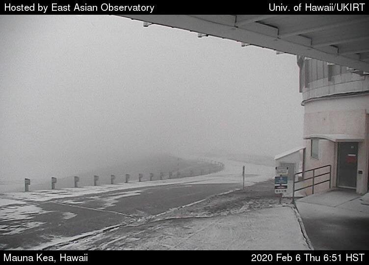 Hawai'i Island summits are under a WINTER WEATHER ADVISORY from noon today (2/6/20) until 6AM tomorrow (2/7/20); also under HIGH WIND WARNING from 6 AM this morning to 11 AM Sunday (2/9/20). From the National Weather Service: Deep moisture along a front will move over the Big Island today and tonight, producing periods of snow showers and freezing rain. The threat of significant winter weather may extend into Friday. Total snow accumulations of up to 5 inches on summits above 10,500 feet. Southwest to west winds will increase through the morning hours over the Big Island summits. Sustained wind speed will range from 45 to 75 mph with localized gusts over 90 mph.
