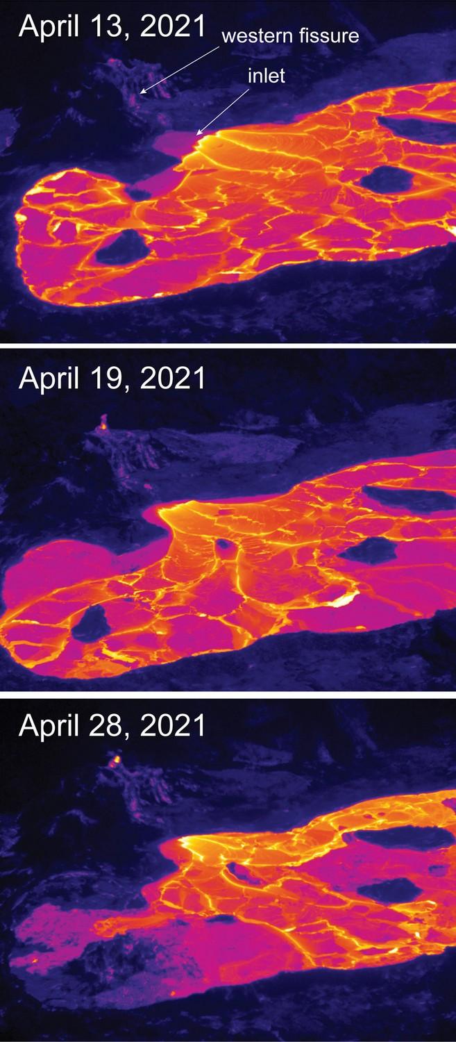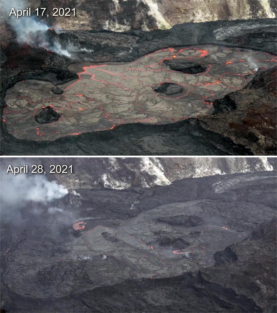 USGS-HVO: Kīlauea's summit eruption continues on the Island of Hawai‘i; Halema‘uma‘u west vent erupts lava into the lava lake, which was 227 m (744 ft) deep this morning, April 29. Gas emissions and seismic activity at the summit remain elevated. HVO field crews—equipped with specialized safety gear—monitor the eruption from within the closed area of Hawai‘i Volcanoes National Park with NPS permission. HVO scientists collect detailed data to assess hazards and understand how the eruption is evolving at Kīlauea's summit, all of which are shared with the National Park Service and emergency managers. Access to this hazardous area is by permission from, and in coordination with, Hawai‘i Volcanoes National Park. Image 1: The lava lake in Halema‘uma‘u crater, at the summit of Kīlauea, remains active but the area of active surface lava has diminished over the past two weeks. This image compares photos from April 17, when active lava extended to the levees along most of the perimeter, to April 28, when only the central portion remained active and very little surface lava reached the levees. USGS photos by M. Patrick. Image 2:
