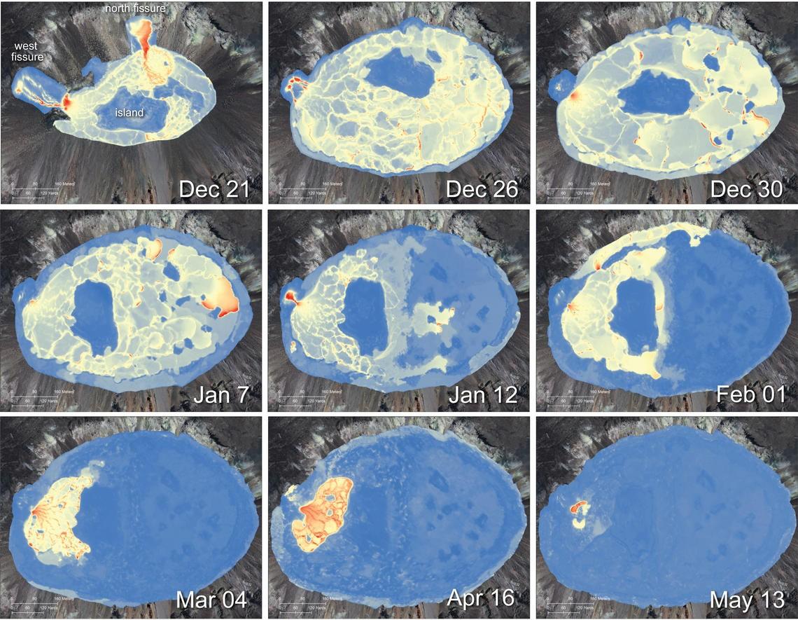 The eruption of Kilauea inside Halema'uma'u is now on day 147 of the ongoing eruption. The intensity of the eruption has dramatically reduced in volume from the early months in late 2020, and early 2021. Today, the eruption is barely ongoing - with gas emissions comparable to periods of inactivity historically. This thermal aerial image compilation was produced by USGS showing the progression of the lava lake. "This compilation shows nine selected thermal maps created for the ongoing eruption in Halema‘uma‘u, at the summit of Kīlauea, which began on December 20, 2020. The maps show the rapid emplacement and growth of the lake in the initial days. The main island shifts and rotates, presumably controlled by the lake currents. In mid-January, the eastern portion of the lake became solidified at the surface, with active surface lava limited to a diminishing area in the western portion of the lake, near the western fissure. By May 13, active surface lava was less than one percent of the total lake area. The declining area of active lava corresponds with a reduction in eruption rates and gas emissions. The color range shows the relative temperatures across the lake, with blue colors indicative of cooler temperatures and red colors indicative of warmer temperatures. USGS maps by M. Patrick and B. Car" ~ USGS
