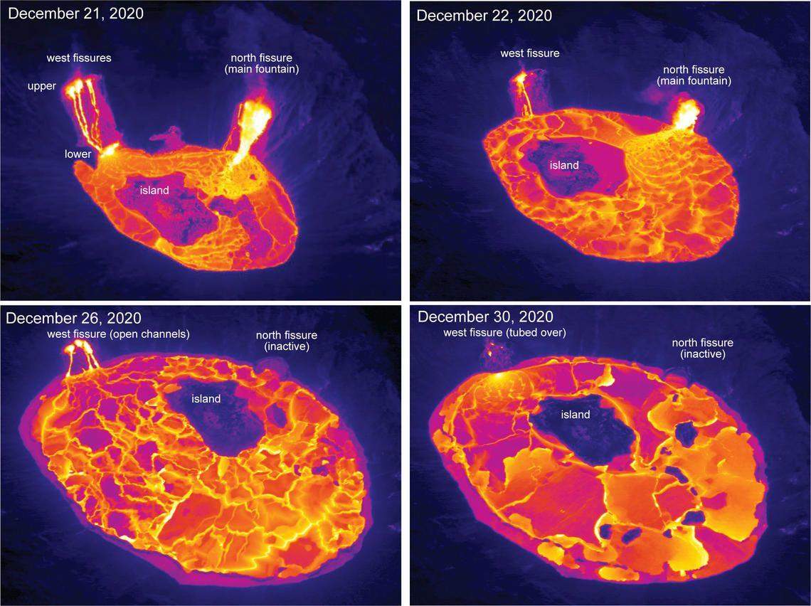 Starting on December 21st, these thermal images capture the development of the lava lake over the last week and a half. Depths of the lava lake: - Dec 21: 289 ft deep - Dec 22: 440 ft - Dec 26: 577 ft - Dec 30: 597 ft - Current depth: fluctuating between 593 to 608 ft deep Caption by USGS: These aerial thermal images of Kīlauea Volcano’s summit compare the changes within Halema‘uma‘u crater over the course of this summit eruption. The first image (upper left) was taken on December 21, the morning after the eruption started, with the north and west fissure vents feeding the lava lake and the middle fissure inactive. The depth of the lava lake was approximately 88 m (289 ft). By the next morning, December 22, (upper right) the lava lake depth increased to about 134 m (440 ft) and had drowned the inactive middle fissure. In the December 26 image (lower left), the north fissure is inactive and only the west fissure vents are feeding lava into the lava lake, which was at a depth of about 176 m (577 ft) that morning. During today’s overflight (lower right), the lava lake was approximately 182 m (597 ft) deep, and lava flowing into the lake was crusted over. Note the change in position over time of the island within the lava lake. USGS thermal images taken by M. Patrick.