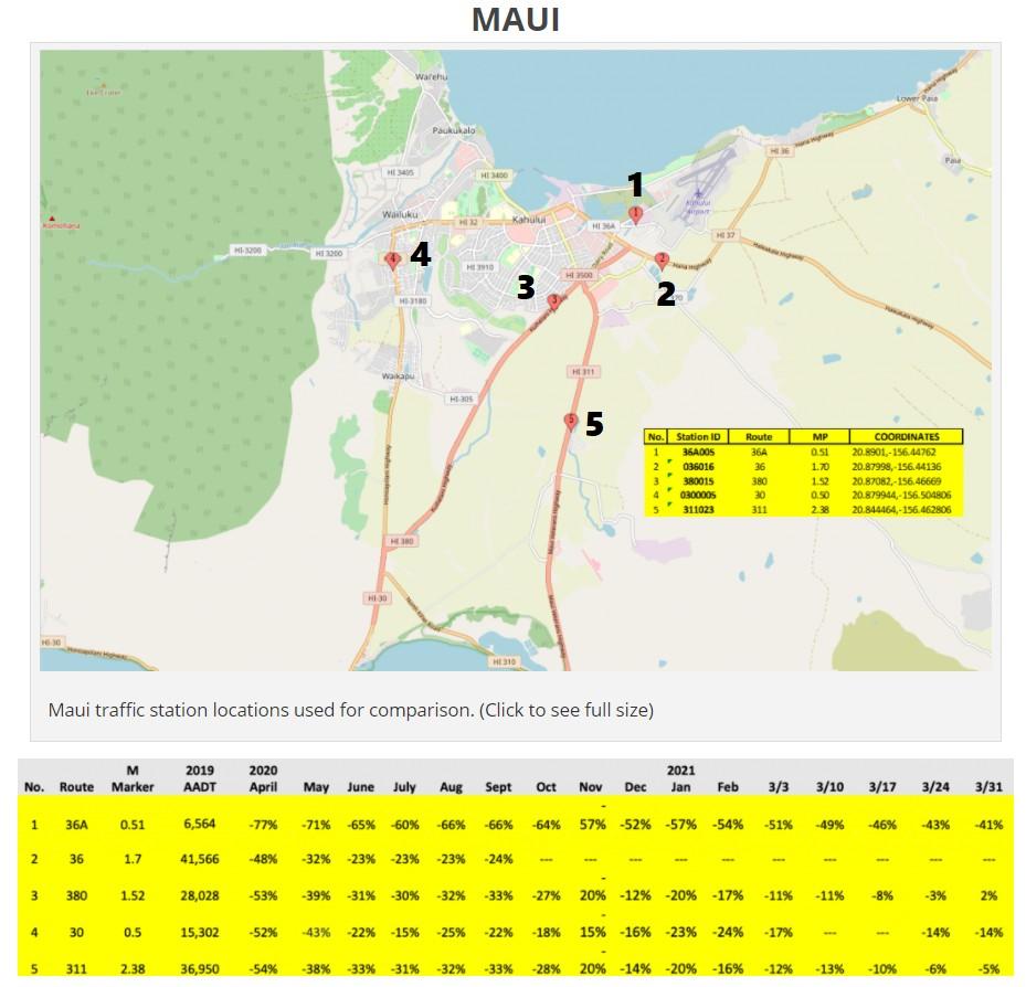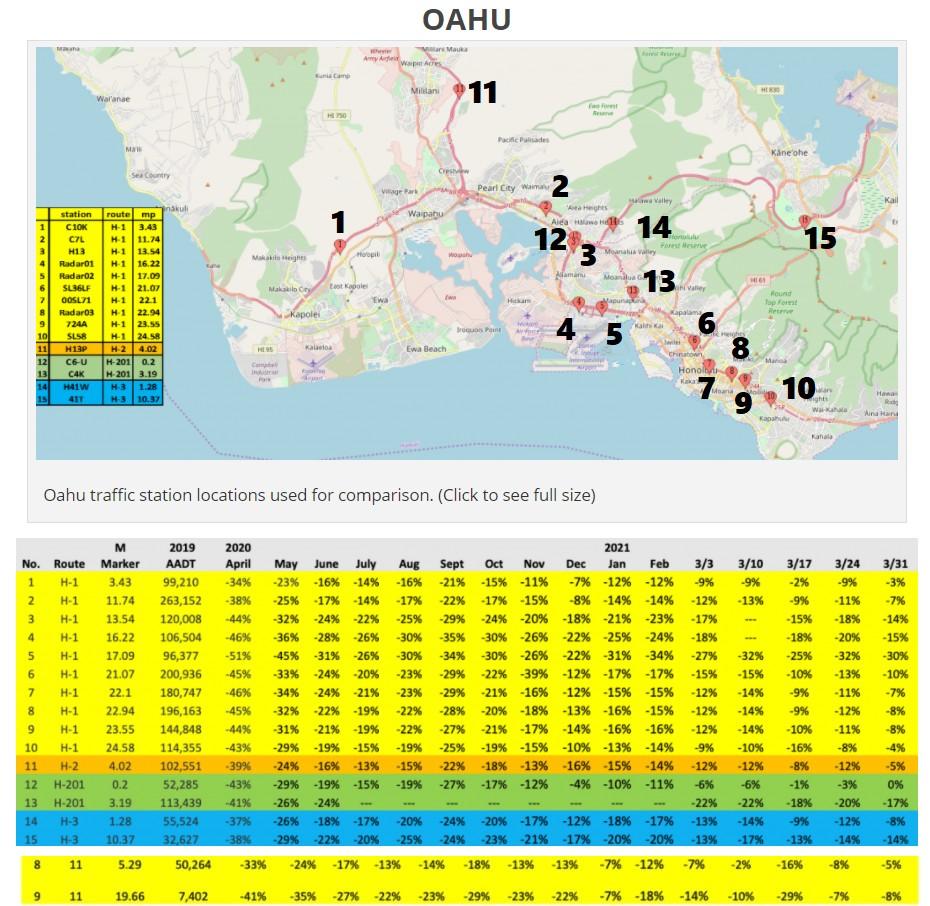 In the most recent update to traffic flow data provided by the Hawaii Department of Transpiration, the amount of vehicles passing through traffic sensors strategically placed around the islands has shown a return to pre-pandemic levels. At the height of Stay-at-home orders in April 2020, Hawaii Island saw roughly the traffic flow cut in half from the previous year, by the end of March 2021 the slow return to 'normal' traffic levels has practically been completed. Looking at the neighboring islands, Hawaii Island is the closest to 2019 levels, with Maui not far behind. Traffic on the H1 and H-3 on Oahu are still roughly 8-15%, and on Kauai the reductions are slower to recover, now at 18-25% reduced from the 2019 Annual Average Daily Traffic estimates. Data for the last year and sensor locations are provided in the graphics by HDOT. Data from HDOT: https://hidot.hawaii.gov/highways/covid-19-traffic-volume-comparison/