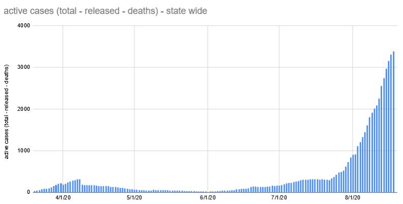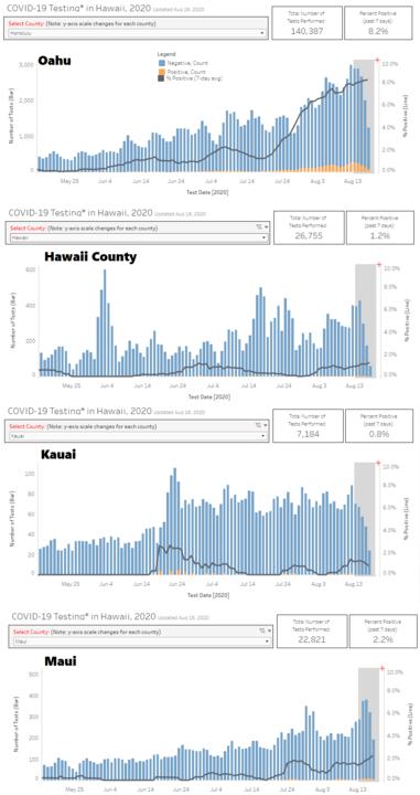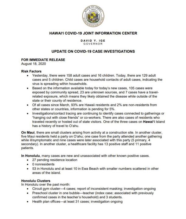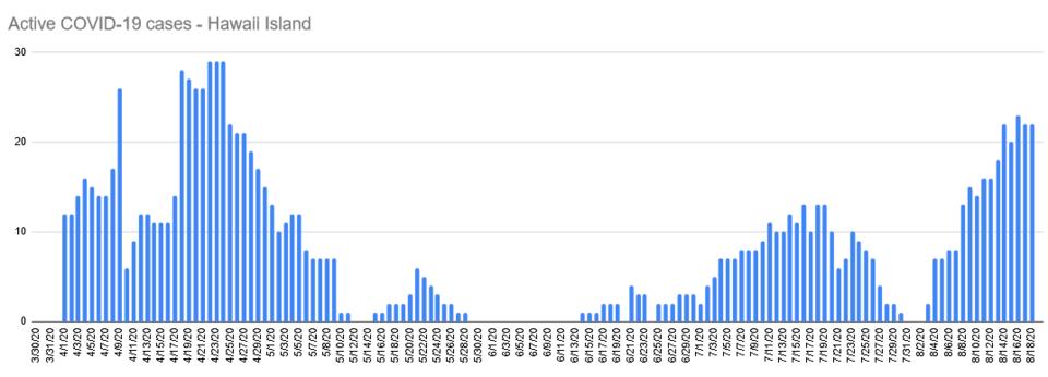 A while back I posted plots of the active COVID cases in Hawaii. Since then cases have more than doubled in one month. On Hawai’i island we are still in pretty good shape - as compared. We don’t get raw daily test numbers by county/island, so the best we get there is the total positivity rate for the state and the graphs from the State DOH. This graph of testing positivity by county was put together by Dane DuPont - A modified version of data presented by the Hawaii Department of Health. DOH has provided more information today on COVID-19 clusters around the state, includes a breakdown of cases at long term care facilities The State (mostly Oahu) outbreak so far is not reflected on island here, either in new cases or in active cases. Somebody on Facebook said “just stay out of the mudhole” - meaning Oahu, but for some people that isn’t really possible (not all medical care is available here), and we do have some community spread here on the island as well. Active cases statewide and for our island below: Updated numbers and plots can be found at https://docs.google.com/spreadsheets/d/1PdGsZyQld3P0Xhud5SV-_k_ukh9tlovaYhKK6nkuakA/edit?usp=sharing Update from State Government below: