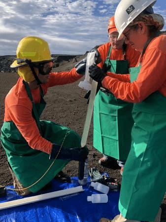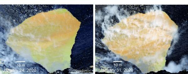 Imagery and text from USGS-HVO Field observations today show that the diameters of the crater lake within Halema‘uma‘u at the summit of Kīlauea are about 94 m (308 ft) north-south and around 192-195 m (630-640 ft) east-west. Too much steam at the west end interfered with measurements this morning. Two small circles above the northeast edge of the water show how much the lake has grown since January 24. On January 17, 2020, USGS-HVO scientists and DOI Unoccupied Aerial System (UAS) team members collected three additional samples of water from the Halema‘uma‘u crater lake. Here, the sampling device and temperature logger were readied for takeoff. The plastic sleeve was attached to the UAS (drone) with a cord about 20 feet (6 m) long. Colored flags were attached to the cord at 5-foot (1.5-m) intervals so that the UAS pilot and other team members could visually gauge how deep the sampler was under the water surface. One water sample was collected close to the lake surface. Two others were collected from a depth of 10-15 feet (3-4.5 m)—one in a yellow-orange patch of water and the other in a yellow-green patch of water. The purpose of the UAS flights was to collect water samples and gas data to assess ongoing volcanic hazards. HVO's work in a culturally sensitive area closed to the general public was done with permission of Hawai‘i Volcanoes National Park. After a sample was collected, HVO team members transferred water from the sampling device to plastic bottles. The scientists wore protective gear, including hardhats in case of rockfall hazards near the crater rim, as well as aprons, goggles, and gloves to shield them from the hot, acidic water. Team members took notes, measured water pH, and evaluated water temperature data for each sample collected. Water temperatures up to 60 degrees Celsius (140 degrees Fahrenheit) were recorded but are an underestimate due to equilibration time issues with the temperature sensor. Remote measurements of the water's surface temperature via a thermal camera have consistently indicated temperatures of 70-80 degrees Celsius (roughly 160-175 degrees Fahrenheit). Field measurements of pH indicated values of 4.3 for the surface water, 4.2 for the yellow-orange water, and 3.9 for the yellow-green water (pH of the October 26, 2019, sample was 4.2). Additional laboratory analyses by USGS California Volcano Observatory colleagues revealed that the three January samples, while more dilute (perhaps due to recent heavy rainfall), are chemically similar to the water sampled in October, which indicates ongoing reactions between the lake water, volcanic gases, and the surrounding basaltic rocks. HVO's work in a culturally sensitive area closed to the general public is done with permission of Hawai‘i Volcanoes National Park. The purpose of the UAS flights was to collect water samples and gas data to assess ongoing volcanic hazards.