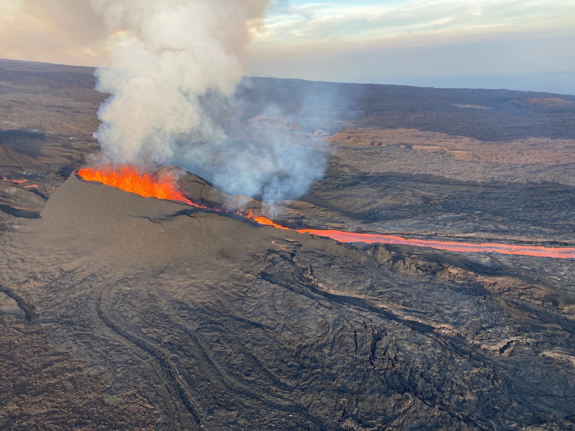 USGS (4:23 PM) - The Northeast Rift Zone eruption of Mauna Loa continues. One active fissure, fissure 3, is feeding a lava flow downslope. Fissure 3 is generating a lava flow traveling to the north toward the Daniel K. Inouye Highway (Saddle Road) that has reached relatively flatter ground and slowed down significantly, as expected. The lava flow has advanced very little since 6:00 a.m. this morning, December 7, when it was about 1.8 mi (2.9 km) from the Daniel K. Inouye Highway (Saddle Road). The flow advance has slowed possibly due to a significant breakout removing lava from the channel about 2.8 mi (4.5 km) behind the tip of the main flow on the east side. The main flow has advanced at an average rate slower than 20 feet (6 meters) per hour during the 24-hour period prior to this morning. The lava flow remains active and is continuously supplied from the fissure 3 vent. HVO crews have installed a new webcam to view the front of the main flow https://www.usgs.gov/observatories/hvo/m9cam-mauna-loa-fissure-3-eruption-northeast-rift-zone Lava flow advance rates may be highly variable over the coming days and week. Lava flows advance more slowly, spread out, and inflate on the flat ground between Mauna Loa and Mauna Kea. Individual lobes may advance quickly, and then stall. Additional breakouts may occur if lava channels get blocked upslope. There are many variables at play, and the direction and timing of flow advances are expected to change over hours to days, making it difficult to estimate when or if the flow will impact Daniel K. Inouye Highway. Sulfur dioxide (SO2) emission rates of approximately 120,000 tonnes per day (t/d) were measured on December 4, 2022, and remain elevated at this time. Volcanic gas is rising high and vertically into the atmosphere before being blown to the west at high altitude, generating vog (volcanic air pollution) in areas downwind. The Hawaii Interagency Vog Information Dashboard has detailed information about vog: https://vog.ivhhn.org/. Forecasts for the dispersion of vog can be found on the VMAP Vog Forecast Dashboard: http://weather.hawaii.edu/vmap/new/. Pele's hair (strands of volcanic glass) fragments are being wafted great distances and have been reported as far Honoka‘a. Tremor (a signal associated with subsurface fluid movement) continues beneath the currently active fissure. This indicates that magma is still being supplied to the fissure, and activity is likely to continue as long as we see this signal. There is no active lava within Moku'āweoweo caldera nor the Southwest Rift Zone. We do not expect any eruptive activity outside the Northeast Rift Zone. ---- END OF USGS UPDATE ---- Image by USGS: A morning overflight on December 7, 2022, provided aerial views of fissure 3 erupting on the Northeast Rift Zone of Mauna Loa. USGS image by M. Patrick.