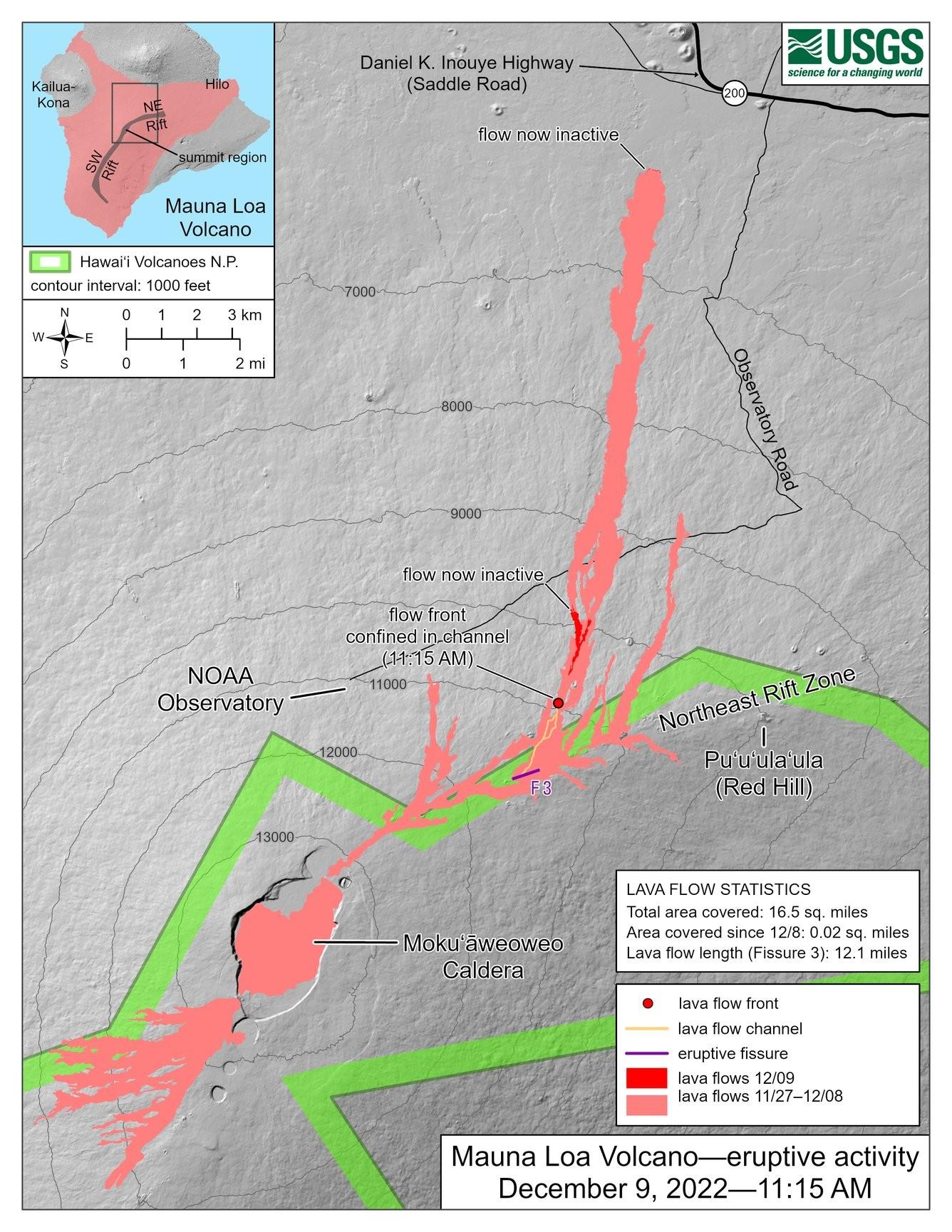 USGS (12.10.22) - The Northeast Rift Zone eruption of Mauna Loa continues. The fissure 3 (F3) vent continues to erupt with a reduced supply of lava and reduced gas emissions this morning. As of 7:00 a.m. today, December 10, a lava pond replaced the fountains at the F3 vent. The pond fed short lava flows that extended only 1.6 mi (2.6 km) from the vent but are already stagnating. The channels below this point appear drained of lava and no longer feed the main flow front. The inactive main flow front remains stalled about 1.7 mi (2.8 km) from the Daniel K. Inouye Highway (Saddle Road) when last measured on the afternoon of December 8. When seen this morning at 7 am, the front appeared to be in the same location. The inactive main flow front still glows at night and may inch northward very slowly as it settles. Sulfur dioxide (SO2) emission rates were also reduced to approximately 30,000 tonnes per day (t/d) as measured on December 8, 2022. The Hawaii Interagency Vog Information Dashboard has detailed information about vog: https://vog.ivhhn.org/. Forecasts for the dispersion of vog can be found on the VMAP Vog Forecast Dashboard: http://weather.hawaii.edu/vmap/new/. Tremor (a signal associated with subsurface fluid movement) continues its slow and steady decline. This indicates that the magma supply to the vent is decreasing. The significance of the reduced supply of lava is not yet clear; it is common for eruptions to wax and wane or pause completely, but none of the 8 recorded eruptions from Mauna Loa’s Northeast Rift Zone returned to high eruption rates after those rates decreased significantly. Nevertheless, the Hawaiian Volcano Observatory continues to closely monitor the current activity. There is no active lava within Moku'āweoweo caldera nor the Southwest Rift Zone. We do not expect any eruptive activity outside the Northeast Rift Zone. ---- END OF USGS UPDATE ---- Map and caption from USGS: The Northeast Rift Zone eruption of Mauna Loa that began the evening of November 27, 2022, continues as of December 9, 2022 (twelfth full day). One active fissure, fissure 3, feeds lava flows downslope to the north. HVO field crews and USGS analysts have accurately mapped some of the most active flows, displayed in red here, along with older flows further uprift, in part of Mokuʻāweoweo caldera, and in the upper summit region southwest of the caldera. Lava flow length was measured by tracing the continuous active channel shown in yellow here and then extending the measurement to the distal lava flow extent measured in satellite data. The total area covered is less than reported in previous days due to refined mapping efforts.