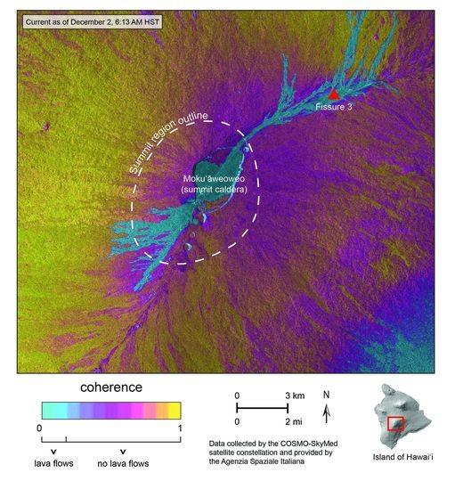 USGS-HVO - Lava eruption from fissure 3 on the Northeast Rift Zone of Mauna Loa continues, but the threat to aviation of significant volcanic ash emission into the atmosphere has passed. For this reason, HVO is reducing the aviation color code from RED to ORANGE. The ground-based volcano alert level will remain at WARNING, reflecting the ongoing hazards of the fissure 3 lava flow. Lava flows are slowly moving north toward Daniel K. Inouye Highway and are spreading out and inflating (thickening) as they advance over low-sloping ground. The fronts of lava flows can break open unexpectedly, sending flows in several directions. Rain on lava creates steam and reduces visibility. If visiting the County of Hawai'i public viewing area, remain with your vehicle and do not approach the flows. The Federal Aviation Administration has issued a temporary flight restriction extending from the surface to 1500 feet (457 meters) above ground level in the eruption area. See: https://tfr.faa.gov/save_pages/detail_2_9210.html ----------- MAP - Coherence map from comparison of radar images showing surface change on Mauna Loa through Dec 2 at 6:13 AM HST. Blue indicates areas covered by lava. These high-resolution COSMO-SkyMed data will be used to update HVO’s forthcoming map.