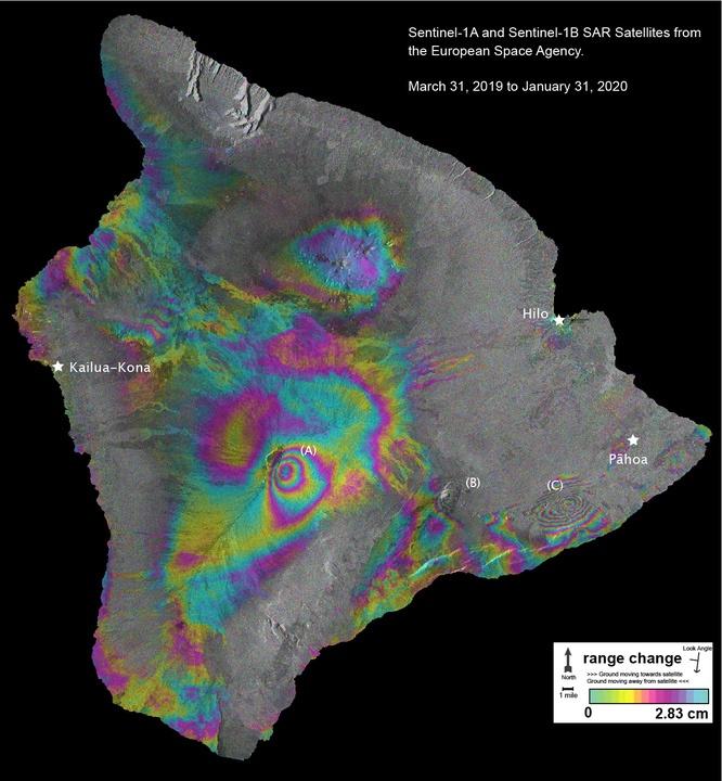 Recently released Interferogram from USGS-HVO shows 2.75 inches of uplift on Mauna Loa between March 2019 and January 2020. Meanwhile, Kilauea's summit has seen 15.7 inches of inflation in the same period. The East Rift of Kilauea has also seen 6.7 inches of inflationary movement. There is no change to the current status of both Mauna Loa and Kilauea. Kilauea ------ Current Volcano Alert Level: NORMAL Current Aviation Color Code: GREEN Mauna Loa ------ Current Volcano Alert Level: ADVISORY Current Aviation Color Code: YELLOW Full text from USGS: " Data from the European Space Agency (ESA) Sentinel-1A and Sentinel-1B satellites on March 31, 2019, and January 31, 2020, produced this interferogram. Each fringe, or band of colors, represents 2.83 cm (1.1 inches) of range change—the distance between the satellite and the ground. Counting fringes gives the total range change between two satellite passes. At point (A) the ground moved closer to the satellite by 7 cm (2.75 in) between the two passes due to inflation of the shallow magma chamber beneath Mauna Loa's summit. The angle at which the satellites viewed the ground shifted the signal slightly east of the summit. Fringes near point (B) at the summit of Kīlauea reflect inflation of the shallow Halema‘uma‘u magma chamber. This inflation has been observed since mid-March 2019, with a total range change of approximately 40 cm (15.7 in). Point (C) is on the middle East Rift Zone near Pu‘u ‘Ō‘ō. Interferograms and GPS data show that inflation has slowly shifted toward Pu‘u ‘Ō‘ō in recent months, during which the range change has been about 17 cm (6.7 in). Speckled areas with no visible fringes are covered by dense vegetation that prevents radar from reaching the ground. Atmospheric water vapor can also affect the radar and is responsible for the circular fringes around Mauna Kea and mottled or linear patterns elsewhere. These signals show that magma is entering the shallow storage system. However these data, together with seismicity and SO2 emission rates do not suggest an imminent eruption. More info on how to read an interferogram is available in a 2019 Volcano Watch article (https://volcanoes.usgs.gov/observatories/hvo/hvo_volcano_watch.html?vwid=1417).