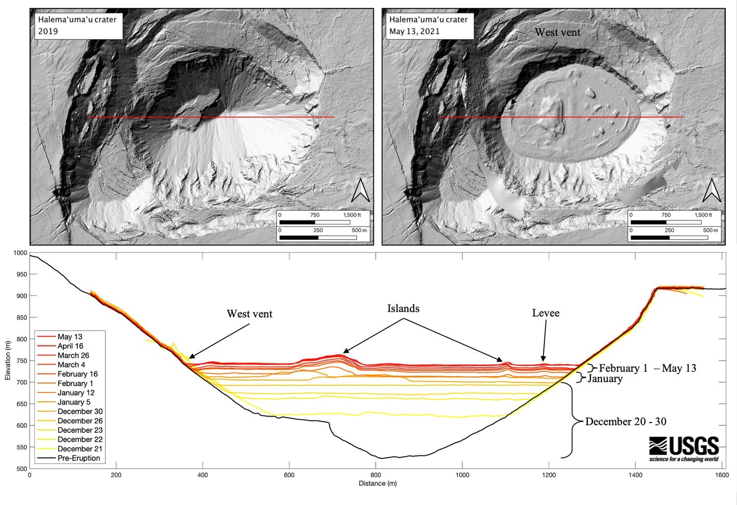 Volcano Watch is a weekly article and activity update written by U.S. Geological Survey Hawaiian Volcano Observatory scientists and affiliates. Release Date: MAY 27, 2021 The Halemaʻumaʻu lava lake celebrated its 5-month anniversary by doing what we all like to do on our special day, taking a break. Hawaiʻi Volcanoes National Park suggested that Kīlauea's summit eruption was getting ready for a “luana iki” or little rest, a more poetic way of describing a pause in eruptive activity. What causes an eruption to pause? A pause is caused by an interruption in the supply of magma to the eruption site or vent. Now, how do we know the eruption has paused? Well, that's a deceptively simple question with a surprisingly complex answer in this situation. Molten lava is glowing red and generally easy to spot erupting from the vent, especially at night. And, likewise, generally easy to tell when it's stopped. However, in the case of the lava lake, the vent supplying the lava eventually crusted over and lava was no longer visible. The best way to tell if lava is still filling the crater (without being able to see the lava) is to see if the level of lava in the lake is continuing to rise. The crater forms a natural measuring cup, except that it's a very strange shape and it has no markings to use to measure volume. We measure the distance to the surface of the lava lake using laser rangefinder instruments and then apply some algebra, trigonometry, and a computer to find the depth, volume, and lava supply rate of the lava lake. The amount of sulfur dioxide gas (SO2) being released from the vent is directly related to the amount of lava being erupted. Both erupted lava volume, approximately 8 million cubic meters or 10 million cubic yards per day, and SO2 gas release, 40,000 tonnes per day, were extremely high at the beginning of the eruption. These exponentially decreased over the course of the eruption to about 70,000 cubic meters or 90,000 cubic yards of lava per day and less than 1000 tonnes of SO2 per day by early- to mid-April. The eruption rates and SO2 gas emissions declined precipitously after April 16th, coincident with the level of lava in the lake reaching the level of the vent. This relationship suggests that the colder, degassed lava within the lake essentially drowned the vent. This period also saw a decrease in seismic tremor related to magma movement and degassing within the dike feeding the vent. In addition, a weak pattern of inflation associated with increased earthquakes beneath Kīlauea caldera suggest that magma has shifted to accumulating at depth instead of rising to the surface. Finally, the top of the lava lake crusted over as the lava supply dwindled and stopped, with the last surface activity seen on May 23rd. So, without being able to directly see if new lava was entering the lake, USGS Hawaiian Volcano Observatory (HVO) scientists used lava lake depth measurements to infer that the lava supply stopped and that the eruption “paused”. Many eruptions undergo brief pauses then resume activity within the same vents. There were numerous pauses followed by resumption of activity during the Puʻuʻōʻō eruption and many have also been recorded in the past including during the Maunaulu, Kīlauea Iki, and 1955 lower East Rift Zone eruptions. So, how do we know if the 2020–21 Halemaʻumaʻu eruption is paused or pau? Statistically, most eruptions that resume, do so within 3 months after pausing. For now, we can only watch and wait to see if activity returns to this same vent system ending the pause. Or alternatively, if the eruption is truly pau, we may be entering a period of quiescence prior to Kīlauea's next eruption. VOLCANO ACTIVITY UPDATES Kīlauea Volcano is not erupting. Its USGS Volcano Alert level is at ADVISORY (https://www.usgs.gov/natural-hazards/volcano-hazards/about-alert-levels). Kīlauea updates are issued weekly. Lava supply to the Halemaʻumaʻu lava lake has ceased and sulfur dioxide emissions have decreased to near pre-eruption background levels. Seismic tremor, persistent during the eruption, has weakened significantly but continues to indicate some shallow magmatic activity. HVO continues to closely monitor Kīlauea’s seismicity, deformation, and gas emissions, and maintains visual surveillance of the summit and the East Rift Zone for signs of renewed activity. There are currently no indications suggesting that a resumption of volcanic activity is imminent. Kīlauea remains an active volcano and future eruptions are possible at the summit or elsewhere on the volcano. For more information on current monitoring of Kīlauea Volcano, see https://www.usgs.gov/volcanoes/kilauea/monitoring. Mauna Loa is not erupting and remains at Volcano Alert Level ADVISORY. This alert level does not mean that an eruption is imminent or that progression to an eruption from the current level of unrest is certain. Mauna Loa updates are issued weekly. This past week, about 39 small-magnitude earthquakes were recorded below Mauna Loa; most of these occurred below the summit and upper-elevations at depths of less than 8 kilometers (about 5 miles). Global Positioning System (GPS) measurements show low rates of deformation in the summit region over the past week. Gas concentrations and fumarole temperatures at both the summit and at Sulphur Cone on the Southwest Rift Zone remain stable. Webcams show no changes to the landscape. For more information on current monitoring of Mauna Loa Volcano, see: https://www.usgs.gov/volcanoes/mauna-loa/monitoring. There were 5 events with 3 or more felt reports in the Hawaiian Islands during the past week: a M2.9 earthquake 19 km (11 mi) E of Kalaoa at 21 km (13 mi) depth on May 26 at 12:36 p.m. HST, a M4.2 earthquake 15 km (9 mi) S of Volcano at 7 km (4 mi) depth on May 23 at 11:40 a.m. HST, a M3.4 earthquake 15 km (9 mi) S of Volcano at 7 km (4 mi) depth on May 23 at 9:38 a.m. HST, a M3.6 earthquake 15 km (9 mi) S of Volcano at 8 km (5