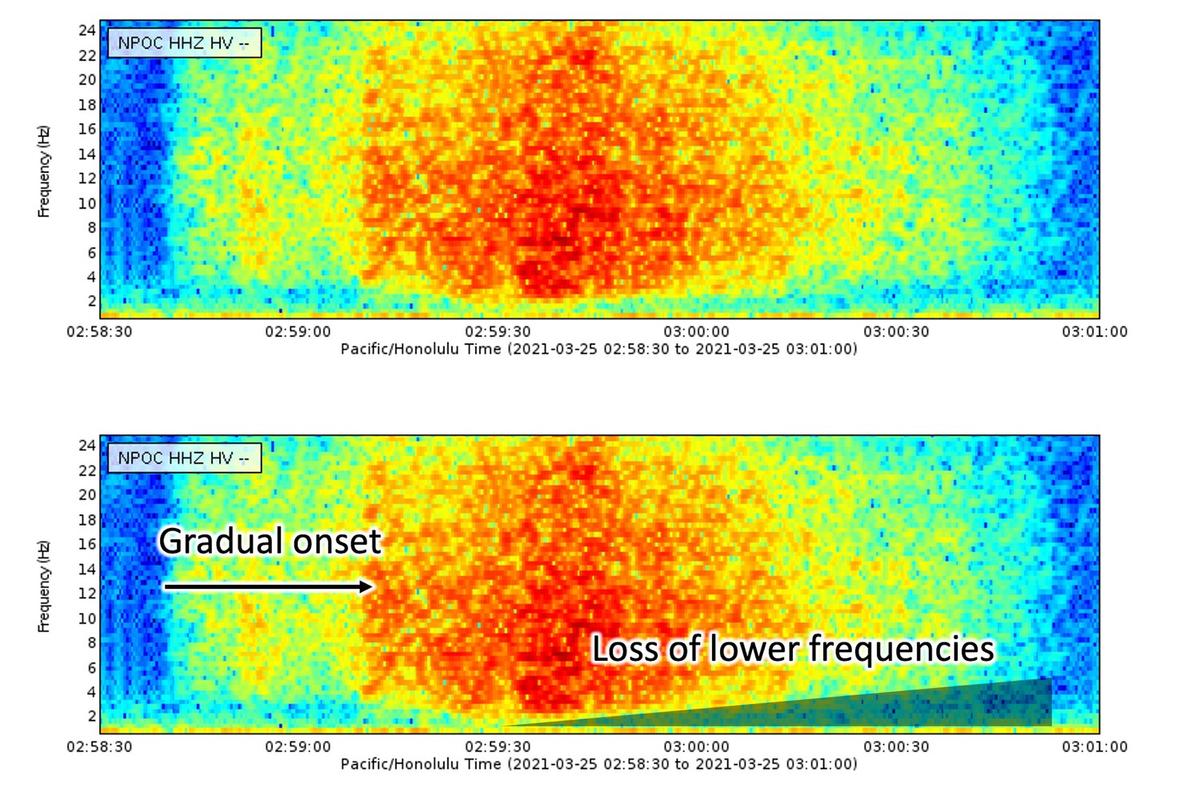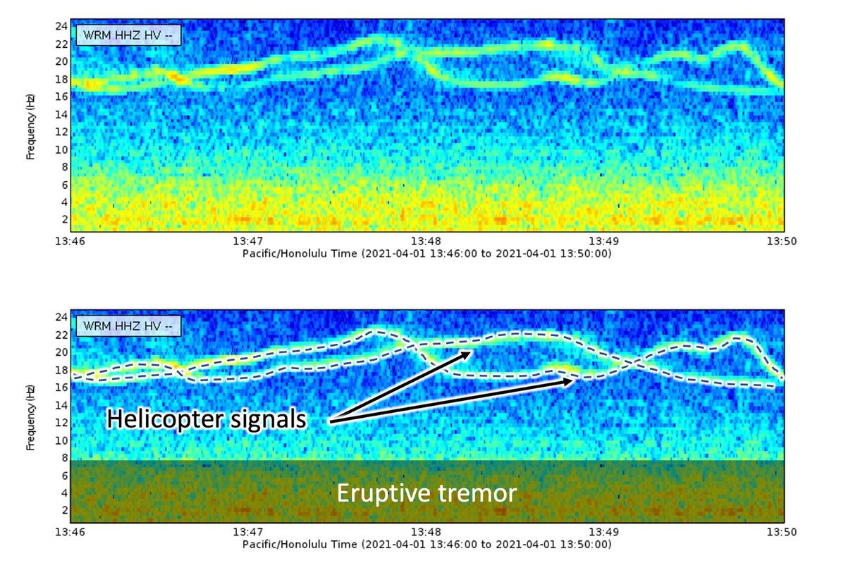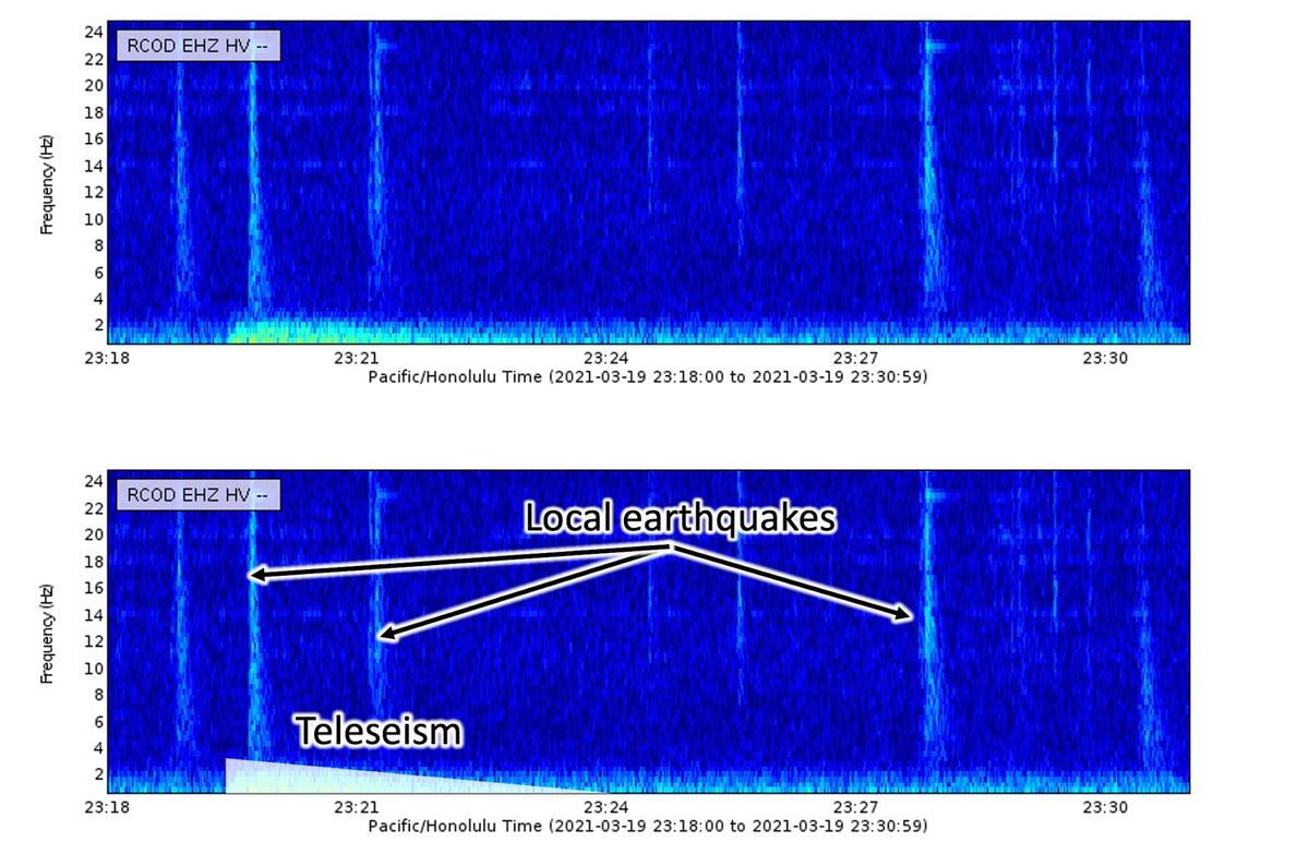 Volcano Watch is a weekly article and activity update written by U.S. Geological Survey Hawaiian Volcano Observatory scientists and affiliates. Release Date: APRIL 8, 2021 The USGS Hawaiian Volcano Observatory (HVO) uses dozens of seismometers to locate individual earthquakes and identify signals that are related to faulting and magma movement within our volcanoes. Seismometers also record vibrations caused by a variety of other sources. Signals generated by seismic noise vary greatly in intensity, duration, and source type. Some are easily identifiable while others remain a mystery. Each region in the world has a different selection of seismic noise depending on its geologic setting, cultural activities, and weather. In today’s article, we’ll describe some of the more interesting sources of seismic noise that HVO seismologists see on a fairly regular basis. The following figures are called spectrograms. These plots can be a useful addition to the squiggly lines (or waveforms) that one typically associates with earthquakes because they allow the observer to easily identify complex or even multiple signals. Time is displayed on the horizontal axis, signal frequency is displayed on the vertical axis, and signal intensity is shown in color. The warmer the color, the stronger the signal is at that specific time and frequency. [Figure 1: April 1, 2021, spectrogram recorded at station STCD, located near Puʻuʻōʻō on Kīlauea’s East Rift Zone. USGS graphic. ] Unsurprisingly, a common source of noise in HVO’s seismic record is bad weather. This is particularly true along Kīlauea’s East Rift Zone. Noise from wind and rain is characterized by its diffuse mid- to high-frequency content. In this specific example, the station starts to record an approaching rainstorm just after 12:40 p.m. HST. Since heavy rain and wind can last for days at a time, these signals tend to be pretty persistent. If an analyst ever has any doubt over whether the signals they’re observing are actually weather, a quick peek at one of the webcams (https://www.usgs.gov/volcanoes/kilauea/webcams) overlooking Ahuʻailāʻau, Puʻuʻōʻō, or Halemaʻumaʻu will quickly confirm their suspicions. [Figure 2: April 1, 2021, spectrogram recorded at station WRM, located near Halemaʻumaʻu at Kīlauea’s summit. USGS graphic. ] This spectrogram shows not one but two commonly observed signals. The most noticeable is the set of ribbon-like lines across the top of the spectrogram. This undulating, high-frequency feature is a helicopter flying near the seismic station, likely carrying HVO staff monitoring the ongoing eruption in Halemaʻumaʻu at Kīlauea’s summit. It is sometimes possible for seismologists to determine the path of a helicopter by tracking it as it passes over multiple stations. Speaking of the recent eruption, the steady low-frequency signal seen on the bottom of this spectrogram as a yellow-orange band is the eruptive tremor that started shortly after lava broke the surface in Halemaʻumaʻu on the night of December 20, 2020. Since then, nearly all stations in the vicinity of the newly formed lava lake at Kīlauea’s summit have been recording this continuous signal. [Figure 3: March 19, 2021, spectrogram recorded at station RCOD, located on Mauna Loa’s Southwest Rift Zone. USGS graphic. ] Teleseisms are earthquakes observed from at least 1000 km (620 miles) away. By the time teleseisms reach very distant stations, all but the lowest frequencies have been lost. The low-frequency signal starting around 11:19 p.m. HST in this March 19 spectrogram is a teleseism from the magnitude-7.0 earthquake that struck near Ishinomaki, Japan last month (https://earthquake.usgs.gov/earthquakes/eventpage/us7000dl6y/executive). For comparison, the broad-frequency “spikes” appearing as lighter-colored vertical lines seen throughout this spectrogram are small local earthquakes. HVO seismologists use the National Earthquake Information Center’s Latest Earthquakes list (https://www.usgs.gov/natural-hazards/earthquake-hazards/earthquakes) along with travel time curves (https://www.usgs.gov/natural-hazards/earthquake-hazards/science/earthquake-travel-times?qt-science_center_objects=0#qt-science_center_objects) to help differentiate between teleseisms and local low-frequency events like tremor that might indicate a change or increase in volcanic activity. [Figure 4: March 25, 2021, spectrogram recorded at station NPOC, located near Puʻuʻōʻō on Kīlauea’s East Rift Zone. USGS graphic. ] Rockfalls have a broad frequency content and gradual onset. These types of events can last for minutes at a time. One trick seismologists use to identify rockfalls is to look for the slight decrease in low frequency content as the event progresses. This feature appears as a shallow ramp on the March 25 spectrogram starting at 2:59 a.m. HST. The majority of recent rockfalls observed by HVO seismologists have been on Puʻuʻōʻō, some of which have been preceded by helicopters flying near (or perhaps even into!) the cinder cone. Around the world, seismographs have been used to document events such as impending hurricanes, whale songs, fans celebrating during big football games, and even nuclear testing. Here in Hawaiʻi, weather, local air traffic, eruptive tremor, and rockfalls are a few of the interesting seismic signals that HVO seismologists can see while monitoring earthquake activity at our active volcanoes. April is Tsunami Awareness Month in Hawai‘i. For information about tsunami preparedness and safety, please visit these websites: TsunamiZone, International Tsunami Information Center, National Weather Service TsunamiReady, and Hawaii Energency Management Agency. VOLCANO ACTIVITY UPDATES Kīlauea Volcano is erupting. Its USGS Volcano Alert level is at WATCH (https://www.usgs.gov/natural-hazards/volcano-hazards/about-alert-levels). Kīlauea updates are issued daily. Lava activity is confined to Halemaʻumaʻu with la