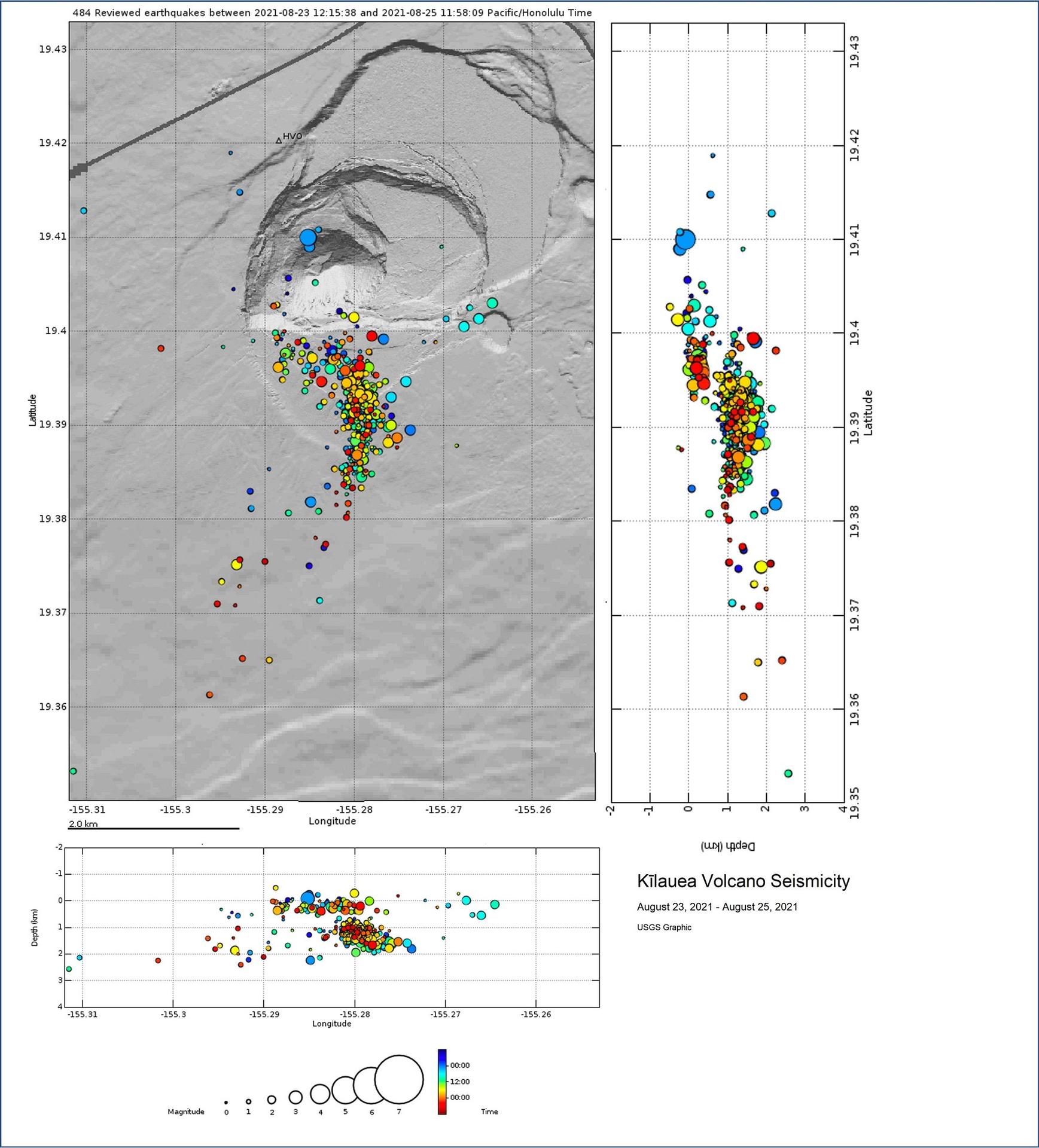 Following the intrusion of magma beneath Kilauea on August 23-24th, USGS Hawaiian Volcano Observatory has brought the alert level of the volcano to YELLOW/ ADVISORY, a downgrade from the ORANGE/ WATCH alert over the previous few days. Update from USGS-HVO: "Over the past 24 hours, earthquake activity and ground deformation levels have decreased in the area beneath the southern part of Kīlauea’s summit caldera within the closed area of Hawaiʻi Volcanoes National Park. These observations indicate that the immediate potential for an eruption is diminished at this time. The U.S. Geological Survey’s Hawaiian Volcano Observatory is lowering the Volcano Alert Level/Aviation Color Code for Kīlauea from WATCH/ORANGE to ADVISORY/YELLOW reflecting this decrease in activity levels. The earthquake swarm that began beneath the south part of Kīlauea caldera, within Hawaiʻi Volcanoes National Park, on August 23, 2021, has waned. Within the past 24 hours, only 10 earthquakes have been detected in this area. The earthquake swarm began in that region at around 4:30 p.m. HST on August 23 and continued until the morning of August 25, 2021. 478 earthquakes were detected during this swarm; the rate of earthquakes detected per hour peaked at 28 events between 7 and 8 p.m. HST on August 24. Most of the earthquakes were between magnitude 1 and 2 and occurred approximately 1-2 km (0.6-1.2 mi) below the Earth’s surface. The earthquake swarm was accompanied by change in the rate and style of ground deformation. Ground deformation in the Kīlauea summit region has leveled off within the past 24 hours and rapid inflation near the region of Kīlauea’s south caldera is no longer being observed. Earthquake activity and ground deformation have decreased together to levels that indicate magma is no longer moving into the region of Kīlauea’s south caldera. These changes indicate reduced potential for an eruption at this time. Kīlauea summit sulfur dioxide (SO2) emission rates remain at very low levels that have persisted since May 2021, when the most recent summit eruption ended. Concentrations of SO2 in ambient air, measured at stations in the Kīlauea summit region, show no changes. The most recent SO2 emission rates, measured on August 12, were 50 tonnes per day, close to levels associated with the non-eruptive period from late 2018 to late 2020 (less than 50 tonnes per day). This is significantly lower than emission rates that averaged over 800 tonnes per day from mid-February to mid-April when the summit eruption of Kīlauea was ongoing. HVO scientists will continue to monitor Kīlauea volcano closely and will issue additional messages as warranted by changing activity. Stay informed about Kīlauea by following volcano updates and tracking current monitoring data on the HVO web page (https://www.usgs.gov/volcanoes/kilauea/volcano-updates) or by signing up to receive updates by email at this site: https://volcanoes.usgs.gov/vns2/.