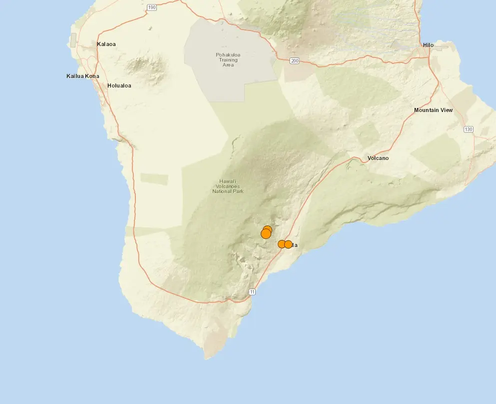 The U.S. Geological Survey's Hawaiian Volcano Observatory (HVO) recorded a magnitude-4.3 earthquake located beneath Mauna Loa's south flank on Saturday, April 3, at 11:15 a.m., HST. This earthquake was preceded by a magnitude-3.9 at approximately the same location on 11:02 a.m., HST. The magnitude-4.3 earthquake epicenter was 5 km (3 miles) NW of Pāhala, near Wood Valley, with a depth of approximately 8 km (5 miles) below sea level. The location can be found on the HVO website at https://www.usgs.gov/observatories/hawaiian-volcano-observatory/earthquakes. More details are available at the National Earthquake Information Center website at https://earthquake.usgs.gov/earthquakes/eventpage/hv72411307. Weak to light shaking, with maximum Intensity of IV on the Modified Mercalli Intensity Scale, has been reported across the Island of Hawai‘i. At this intensity, significant damage to structures is not expected. The USGS "Did you feel it?" service (http://earthquake.usgs.gov/dyfi/) received over 130 felt reports within the first hour of the earthquake, including one report from Kaua‘i. According to HVO Scientist-in-Charge Ken Hon, the earthquake had no apparent effect on Mauna Loa or Kīlauea volcanoes. “At this time, we have not observed any changes in activity at Mauna Loa or Kīlauea as a result of this earthquake. Please be aware that aftershocks are possible and may be felt. HVO continues to monitor Kīlauea and other Hawaiian volcanoes for any changes.” Both the magnitude-4.3 and magnitude-3.9 earthquakes appear to be slip along vertical faults caused by southeast motion of Mauna Loa’s south flank. Today’s earthquakes are significantly shallower and west of the location of the ongoing seismic swarm under the Pāhala area that began in August 2019. This does not represent a significant departure from the seismic activity observed over the past year and the Volcano Alert Level for Mauna Loa remains at ADVISORY. Other Mauna Loa monitoring data streams show no significant change in deformation rates or patterns that would indicate increased volcanic hazard at this time. HVO continues to monitor Hawaiian volcanoes for any changes. The Alert Levels / Color Codes remain at WATCH/ORANGE for Kilauea and at ADVISORY/YELLOW for Mauna Loa at this time.