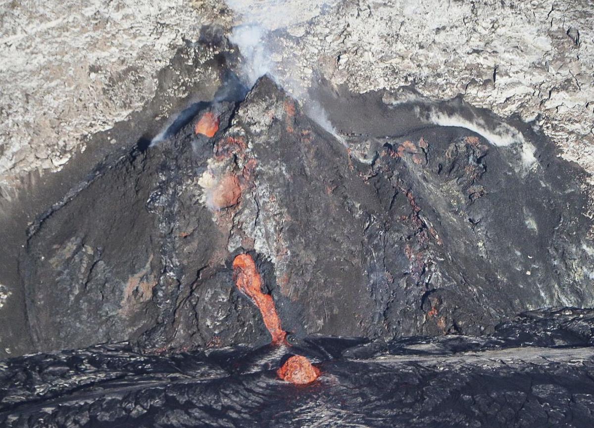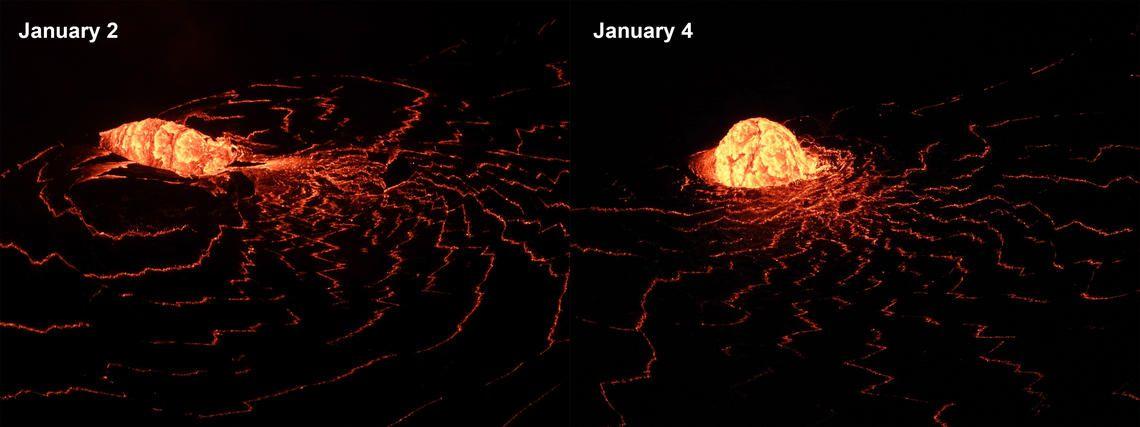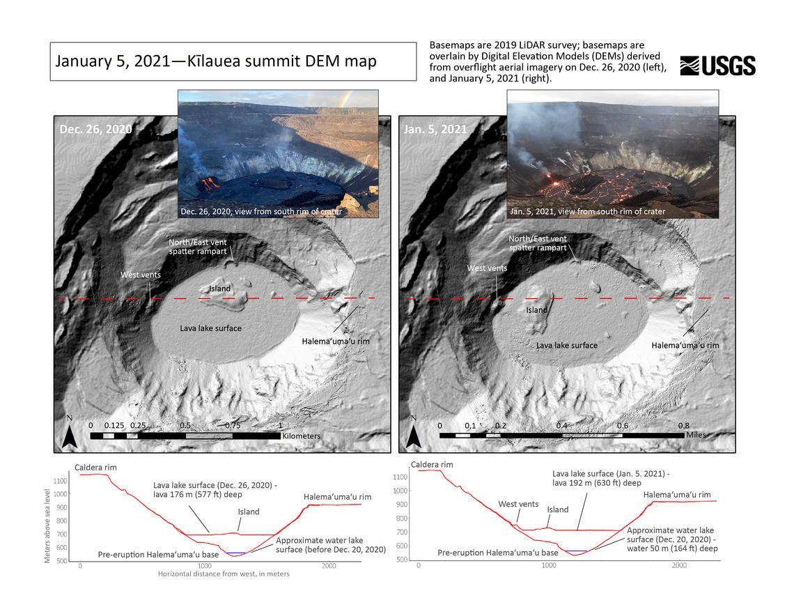 Tracker Summary: Western Fissure still active with low fountaining and weak spatter. The lava lake is slowly gaining depth, and now at ~630 feet deep. The top layer of the lava lake is perched above the edges, creating a perched pond roughly 1-2 meters elevated from the perimeter. ---------------------------- Full update from USGS: Activity Summary: Lava activity is confined to Halemaʻumaʻu with lava erupting from vents on the northwest side of the crater. Tuesday afternoon (Jan. 5), the lava lake was 192 m (630 ft) deep and perched 1-2 m (1-2 yds) above its edge. SO2 emission rates were still elevated. Summit Observations: Sulfur dioxide emission rate measurements made on Sunday (Jan. 3) were in the range 3,000-6,500 t/d since last Sunday (Dec. 27)--the same range of values that was common for emissions from the pre-2018 lava lake. Summit tiltmeters recorded weak deflationary tilt since Jan. 1. Seismicity remained elevated but stable, with steady elevated tremor and a few minor earthquakes. East Rift Zone Observations: Geodetic monitors indicate that the upper portion of the East Rift Zone (between the summit and Puʻu ʻŌʻō) contracted while the summit deflated at the onset of this eruption. There is no seismic or deformation data to indicate that additional magma is currently moving into either of Kīlauea’s rift zones. Halemaʻumaʻu lava lake Observations: The west vents spattered from the top of a small cone plastered on the northwest wall of Halemaʻumaʻu crater. This morning, lava is flowing down a narrow channel to the lake and feeding a small dome fountain in front of the west vents probably from a submerged portion of the vent. The lava lake was 192 m (630 ft) deep Tuesday afternoon (Jan. 5) and had a volume of about 27 million cubic meters (35 million cubic yards). The most recent thermal map (Jan. 5) provided the perched lake dimensions as 760 by 520 m (830 by 570 yds) for a total area of 28 ha (70 acres)--slightly smaller than on Dec. 30 when the pervious thermal map was made. As of Tuesday (Jan. 5), the lake was perched about 1-2 m (1-2 yds) above its narrow edges; overflows onto the narrow edge slowly elevated a low wall around the lake similar to the wall around an above-ground swimming pool. The main island of cooler, solidified lava floating in the lava lake continued rotating counter-clockwise, in front of the west lava source filling the lake, while the 11 smaller islands moved a bit but remained in the east end of the lake. The dimensions of the main island remained the same: about 250 m (820 ft) in length, 135 m (440 ft) in width, and about 3 ha (7 acres) in area based on the Jan. 5 thermal map. Measurements Friday afternoon (Jan. 1) showed that the island surface was about 6 m (20 ft) above the lake surface. Yesterday afternoon, (Jan. 4), the island was measured as 7-8 m (8-9 yds) higher above the lake surface. ---- Images and captions from USGS (in order that they appear) - Image 1: The ongoing eruption at Kīlauea Volcano’s summit, within Halema‘uma‘u crater, continues to erupt from the west vent (left). Yesterday evening, January 4, the lava lake was measured at approximately 191 m (626 ft) deep. No major changes have been observed over the past week. HVO scientists continue to monitor the eruption within an area of Hawai‘i Volcanoes National Park that remains closed to the public for safety reasons. View is looking to the north. USGS photo taken by M. Patrick on January 4 at 6:08 p.m. HST. - Image 2: At approximately 8:00 a.m. HST this morning there was a small breakout from the lower part of the west vent tube. This telephoto aerial photograph taken at about 8:30 a.m. HST during a HVO overflight of Halema‘uma‘u crater, shows the newly exposed lava channel entering the lava lake. Lava also continues to enter the lava lake through the tube, which is producing the small dome fountain at the lake margin below (lower center). USGS photo taken by B. Carr on January 5, 2021. - Image/map 3: Topography of Halema'uma'u crater, at the summit of Kīlauea Volcano, on December 26, 2020 (left), and January 5, 2021 (right). These Digital Elevation Models (DEMs) are created from aerial imagery collected during helicopter overflights. They show that the lava lake within Halema'uma'u continues to rise and deepen. Eruptive vents are evident on the wall of Halema'uma'u, with the north, inactive vent being progressively buried as the lava lake rises. The largest "island" that was oriented in an east-west direction along its long axis on Dec. 26 was oriented in a north-south direction on Jan. 5, and had drifted closer to west end of the lava lake and active west vents. As of yesterday, Jan. 5, the lava lake is 192 m (630 ft) deep. Halema'uma'u DEMs by B. Carr. Graphic by K. Mulliken. -Image 4: The eruption from the west vent in Halema‘uma‘u crater continues at Kīlauea’s summit. Nighttime telephoto images from January 2 (left) and January 4 (right) compare the recent changes in the dome fountain at the west vent inlet into the lava lake. By January 4, the small dome fountain is more uniform and less elongated. USGS photos by M. Patrick.