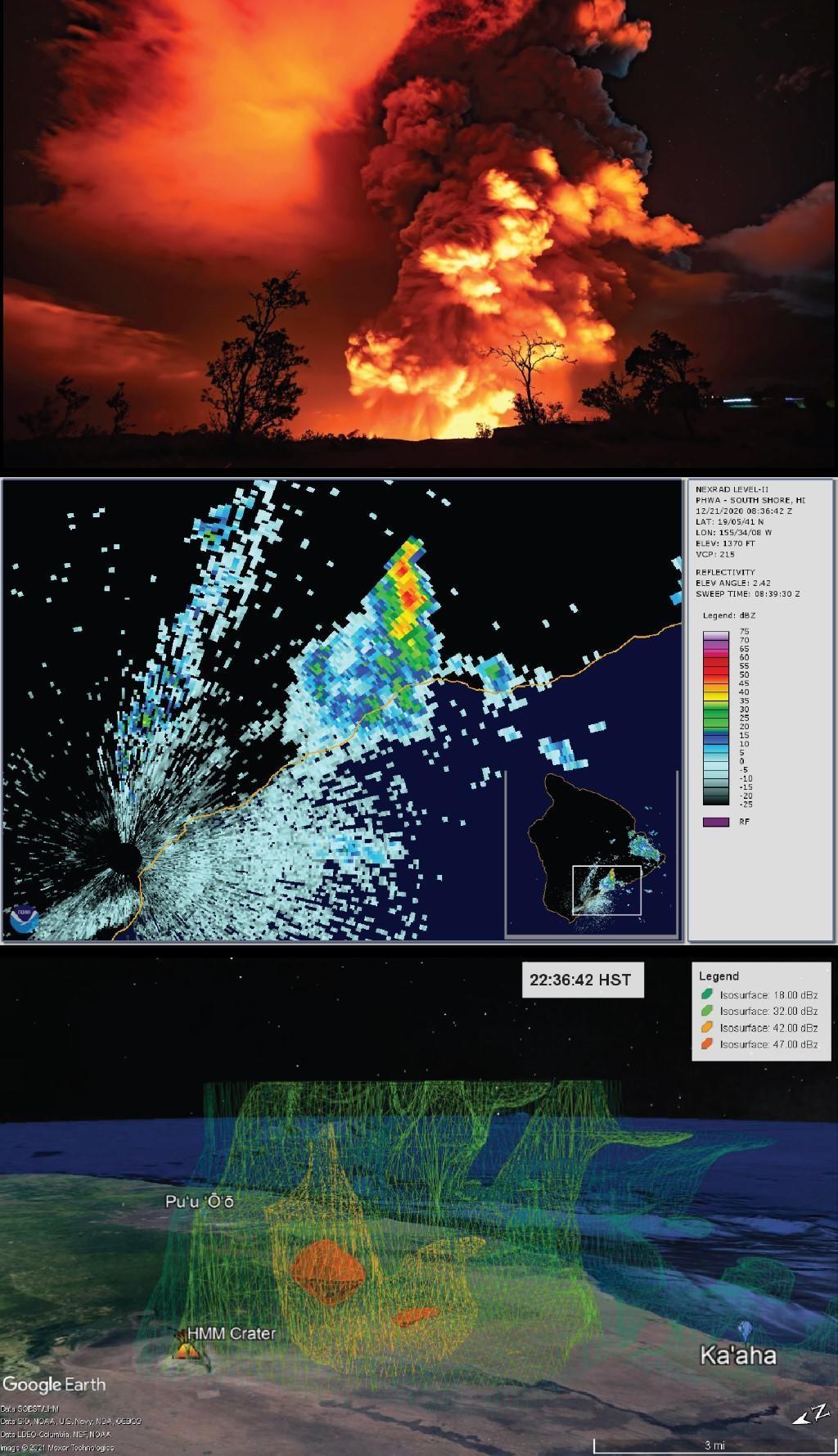 This week marks the second anniversary of the appearance of water in Kīlauea’s Halema‘uma‘u crater, so it seems timely to discuss the water lake’s demise last December 20, or rather, its transformation into a volcanic plume and how we use weather radar to investigate how that happened. The word ‘radar’ recalls images of a meteorologist forecasting weather, or aircraft blips on a green radar display, as frequently portrayed in the movies. RADAR is an acronym for Radio Detection And Ranging, a tool that has been broadly used since its conception in the early 1900s. Today, radar has many uses: in the atmosphere to track weather systems and aviation activity, in space to image the Earth and extraterrestrial bodies from satellites, and even in the ground to detect buried objects. Volcanologists currently use several different types of radar to study volcanic activity. Radar operation uses an antenna that focuses pulses of energy as it scans specific directions and angles. The pulses travel at the speed of light and intersect objects in their path, such as mountains, buildings, airplanes, birds, raindrops, or volcanic ash. As a pulse hits an object, a fraction of its energy is reflected toward the antenna. The reflected energy is then measured and processed to give values of “reflectivity.” Reflectivity is most sensitive to an object’s size and shape, though since a pulse can interact with many objects simultaneously (for example, droplets in a cloud), the concentration of objects is also important. Radar antennas can scan 360 degrees around a station at various elevation angles and produce nearly complete atmospheric coverage within 100 or more miles in just a few minutes. This is how meteorologists present nearly continuous coverage of weather systems worldwide. Weather radar is also an extremely important tool for studying explosive eruptions. Radar pulses reflecting off suspended ash, water droplets, or ice crystals in volcanic plumes provide insight into the plume’s composition and 3D structure. Doppler radar systems used to measure wind speed can also measure turbulence structures in plumes which allows us to track how they capture air, grow in size, and rise through the atmosphere. Using tens of scans per hour, we can measure plume and eruption evolution in time. This can aid in hazard assessment and eruption interpretation. The Island of Hawai‘i hosts two WSR-88D radar stations, at South Point (PHWA) and Kohala (PHKM). The December 20, 2020, eruption plume was visible to both stations, so their data help understand this interesting eruption. The water lake in Halema‘uma‘u was 50 m (164 ft) deep and growing when Kīlauea summit erupted on December 20th. A new fissure opened above the lake on the crater wall at 9:30 p.m. HST. A large volume of lava spilled down into the lake, boiling the water, and producing a volcanic steam plume. Unlike explosive ash plumes that erupt at high velocities directly from a vent, this plume originated from the boiling water, carried little ash, and began rising immediately but slowly, reaching 13 km (43,000 ft) above sea level at its peak. By 11:00 p.m., HST, the water had vanished, replaced by a growing lava lake. Radar measurements of the plume were accessible minutes after the plume appeared and clearly show its development, increasing height and intensity with the opening of the new fissure, and detachment and decline after the water lake dried. We use standard 2D radar scans to render a 3D plume visualization shown as reflectivity isosurfaces (3D contours). The visualization displays how plume height, structure, and rise/fall rates change through time. It shows that the plume pulsed, likely related to changes in lava effusion rates or lava-water contact area. We can use the radar models to locate areas of interest for sampling deposits from the plume on the ground, and to compare high reflectivity zones with phenomena like lightning to correlate visual observations to internal plume dynamics. Lastly, we can calculate concentration throughout the plume, the path of the plume, and the total ash volume transported and deposited during the eruption. All this from free data! Another advantage of weather radar is accessibility. Many stations provide free publicly available near-real-time data, accessible through the National Oceanic and Atmospheric Administration (NOAA) free Weather and Climate Toolkit software. Anyone interested in the wonders of radar and volcanoes can analyze data from their own computer. Radar is a vital and growing asset in volcanology that will be increasingly useful to the USGS Hawaiian Volcano Observatory in future eruption scenarios. --- Image 1: "December 20, 2020, Kīlauea volcanic plume shown from the Gemini Observatory on Mauna Kea (left) and a 3D radar visualization from the same perspective. The radar reflectivity isosurfaces reveal the plume’s internal and external structure." Image 2: "Example of 2D and 3D radar visualization of the December 20, 2020, Kīlauea volcanic plume. Displayed in photo (top, USGS photo), 2D radar scan from station PHWA (middle, NOAA Weather and Climate Toolkit), and 3D radar visualization (bottom, Google Earth)." IMAGE CREDIT TO USGS-HVO Volcano Watch is a weekly article and activity update written by U.S. Geological Survey Hawaiian Volcano Observatory scientists and affiliates. This week’s article was written by Cascades Volcano Observatory postdoctoral researcher Ryan C. Cahalan.