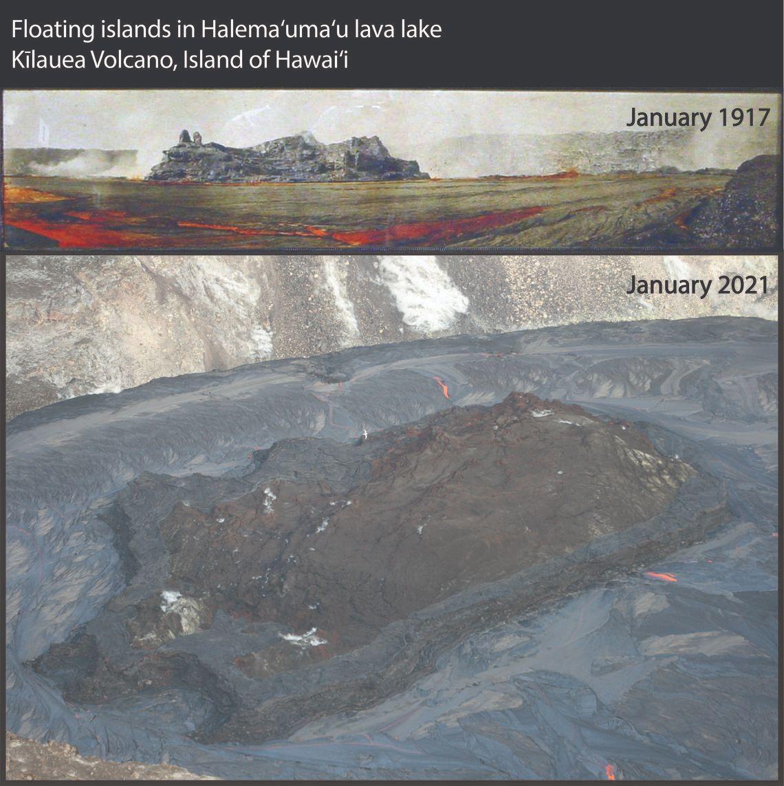Words matter in volcanology just as in the rest of society. Words matter among volcanologists themselves, of course, but they particularly matter in our dealings with the public, when we attempt to both tell what is happening and educate about how volcanoes work. Accuracy of words promotes understanding and clarity of thought and is essential to both telling and educating. The terminology of volcanology labors under the burden of past misunderstandings about volcanoes. Ancients believed that volcanoes were somehow related to fire. Fire caused eruptions, and volcanoes erupted fire. Fire raged underground, managed by the Roman god Vulcan (Hephaestus is the Greek equivalent), and volcanoes were formed at Vulcan’s forge. Many terms we use today reflect the ancient misunderstandings. Igneous, a scientific term used for one of the three broad families of rocks (sedimentary and metamorphic are the other two) derives from the Latin word for fire, ignis. Volcano comes from Vulcan. Fire produces ash, scoria, and cinder, but all three terms are used by volcanologists for particles erupted from volcanoes that have nothing to do with fire. These old words are a bit quaint and even charming, but their long-term usage makes them permissible among volcanologists. All this is fine. Words have to derive from something. A problem comes in, though, if scientists use fire terms as metaphors when dealing with the public. Perhaps the best, or worst, examples of misleading phrases are fire fountain, curtain of fire, and river of fire. Colorful metaphors, to be sure, but just plain wrong. Fire neither fountains nor flows nor forms curtains. Sadly, fire fountain and curtain of fire are terms still used by some volcanologists, though they are slipping away. Lava fountain, line or row of lava fountains, and river of lava, respectively, are the preferred terms in discussion with the public as well as among ourselves. Fire makes smoke. Volcanoes don’t burn, so they don’t smoke. Instead, fume or gas rises above them. This is an easy distinction to make in Hawaiʻi, because residents are all too familiar with vog (volcanic air pollution), which smells nothing like smoke. Of course, heat from volcanoes can set fires that smoke, and flames from hot gas burning in air can sometimes decorate vents. Fiery is a word that is often applied to a volcanic scene. It means “consisting of fire or burning strongly and brightly” and so is inappropriately used for an eruption. This word is so widely used, however, that volcanologists are unlikely to win the semantic argument. Other examples of questionable word usage for volcanoes do not involve the fire metaphor. What happens when some things just don’t have a word to accurately describe them? Do we stretch the meaning of an existing word or come up with something new? Examples of this problem are the masses of solid material floating in the current lava lake in Halemaʻumaʻu at Kīlauea’s summit. These things moved slowly around in the lake and rose as the lake deepened. The masses are therefore not islands, which are stationary relative to their surroundings. USGS Hawaiian Volcano Observatory (HVO) volcanologists 100 years ago used the phrase ‘floating islands’ for such features, an expressive but inaccurate phrase. HVO used the word “island” to describe these drifting masses in Halema‘uma‘u’s current lava lake, though raft may be a better term to acknowledge their mobility. A raft, however, is usually perceived as a floating mass having a shallow draft, but for various reasons we suspect (admittedly with little confidence) that the largest current island/raft has a relatively deep draft reflecting a sluggish foundation. A colleague at the Smithsonian Institution suggested, only half in jest, that the floating masses be termed ‘basalt bergs’ by analogy with ice bergs, which are mostly submerged. Floating islands, rafts, basalt bergs, or something else—only time will tell what name finally sticks. In Lewis Carroll’s ‘Through the Looking Glass,’ Humpty Dumpty tells Alice scornfully “When I use a word…it means just what I choose it to mean—neither more nor less.” Laudable, as long as he chooses the right meaning! That is the problem we volcanologists face when telling and educating the public: how to choose the right word with the right meaning and do it accurately. In this sense, as in so many others, words matter. ---- Caption and Image from USGS: Islands have been observed in Kīlauea lava lakes for more than 100 years—some move and some are moored. These two photographs of Halemaʻumaʻu crater from 1917 (top) and 2021 (bottom) show islands floating in lava lakes. The 1917 photographic panorama was taken from the edge of the lava lake, which was only about 30 m (100 ft) below Kīlauea caldera floor. The island rose about 20 m (65 ft) from the surface and was 100 m (330 ft) wide in the direction depicted. In January 2021, the largest island is about 250 m (820 ft) long, 135 m (440 ft) wide, and roughly 20 m (65 ft) tall. The island has rotated and moved both eastward and westward since its formation on the first day of the eruption. 2021 photograph by K. Mulliken.